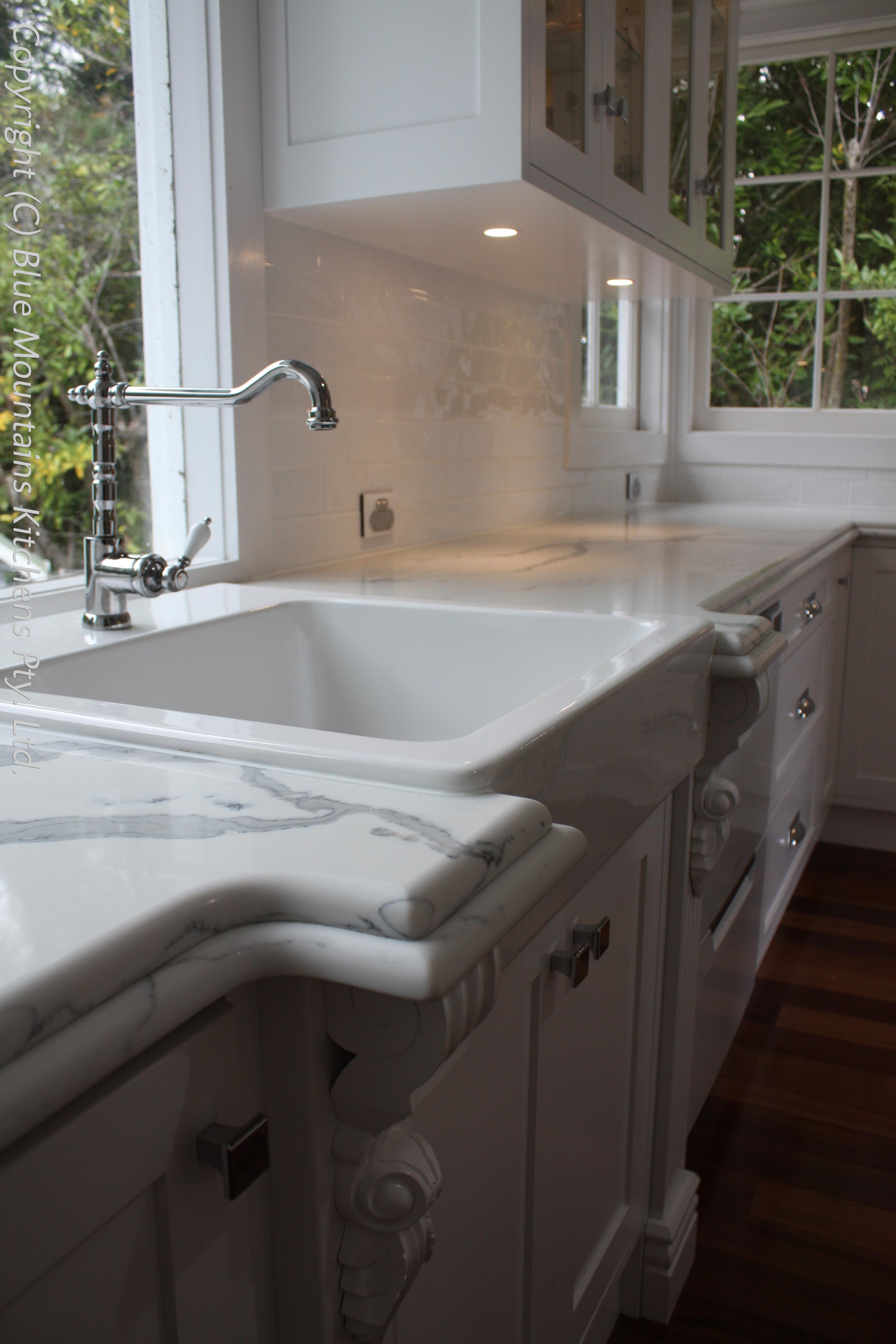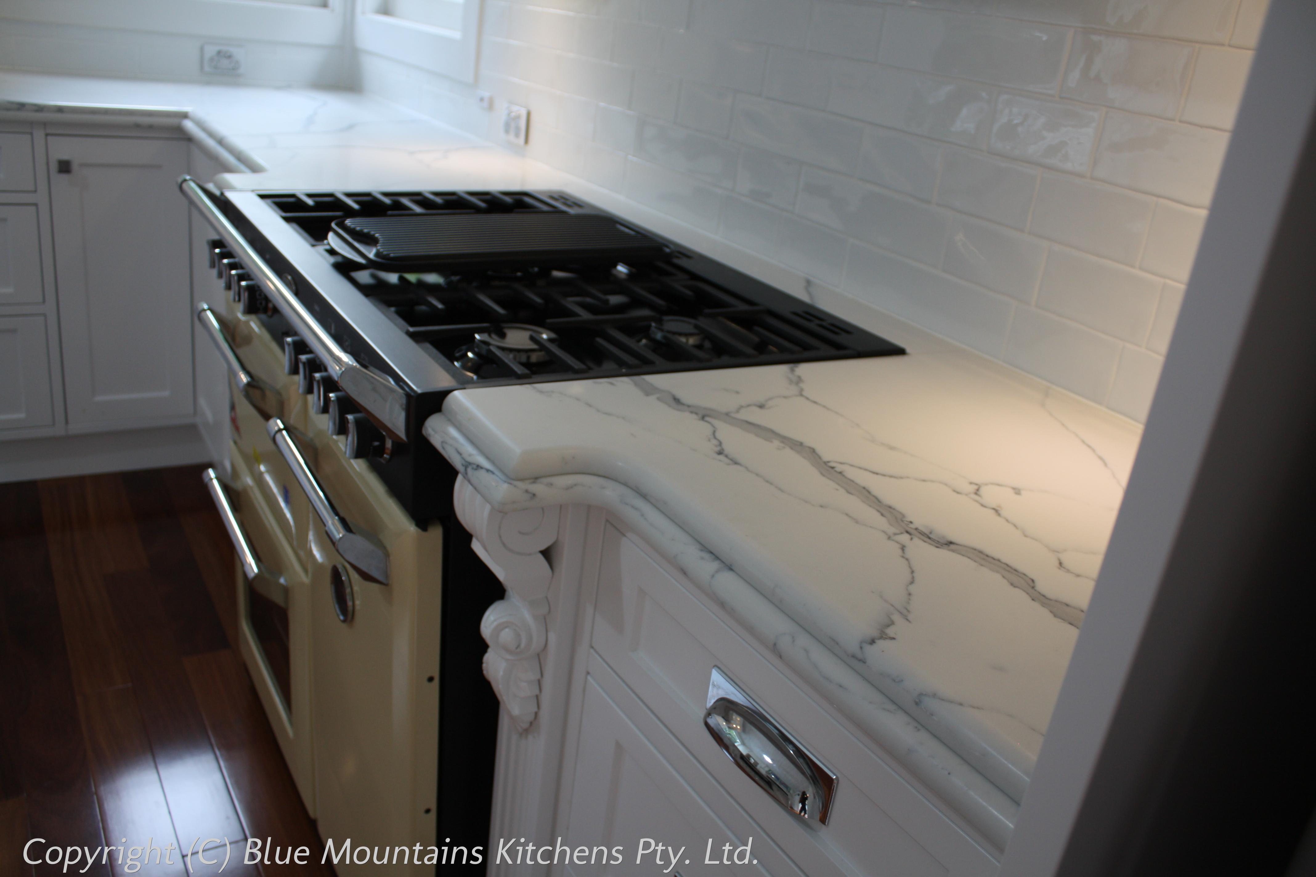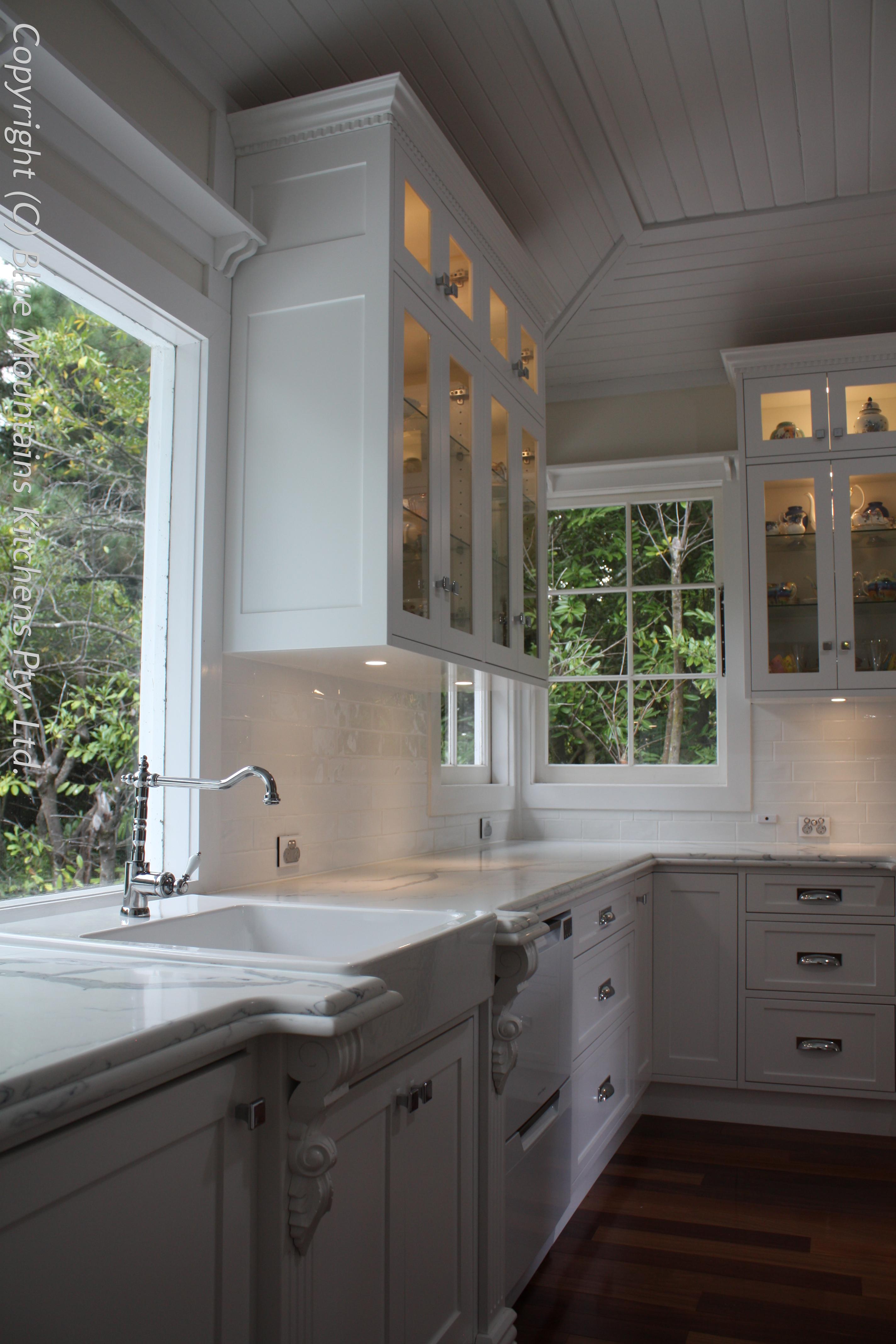 This highly detailed kitchen was inspired by classic Hamptons Style. 40mm double bullnose tops, ornate capping mould with dental capping, 25mm drawer and door surrounds, decorative corbels the list goes on...